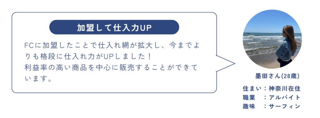 さらに、各加盟店が新しく契約した仕入れ網を他の加盟店間でも共有することで、高効率で仕入れ力を向上し合うことができ、FC全体で仕入れ網を拡大していきます。
