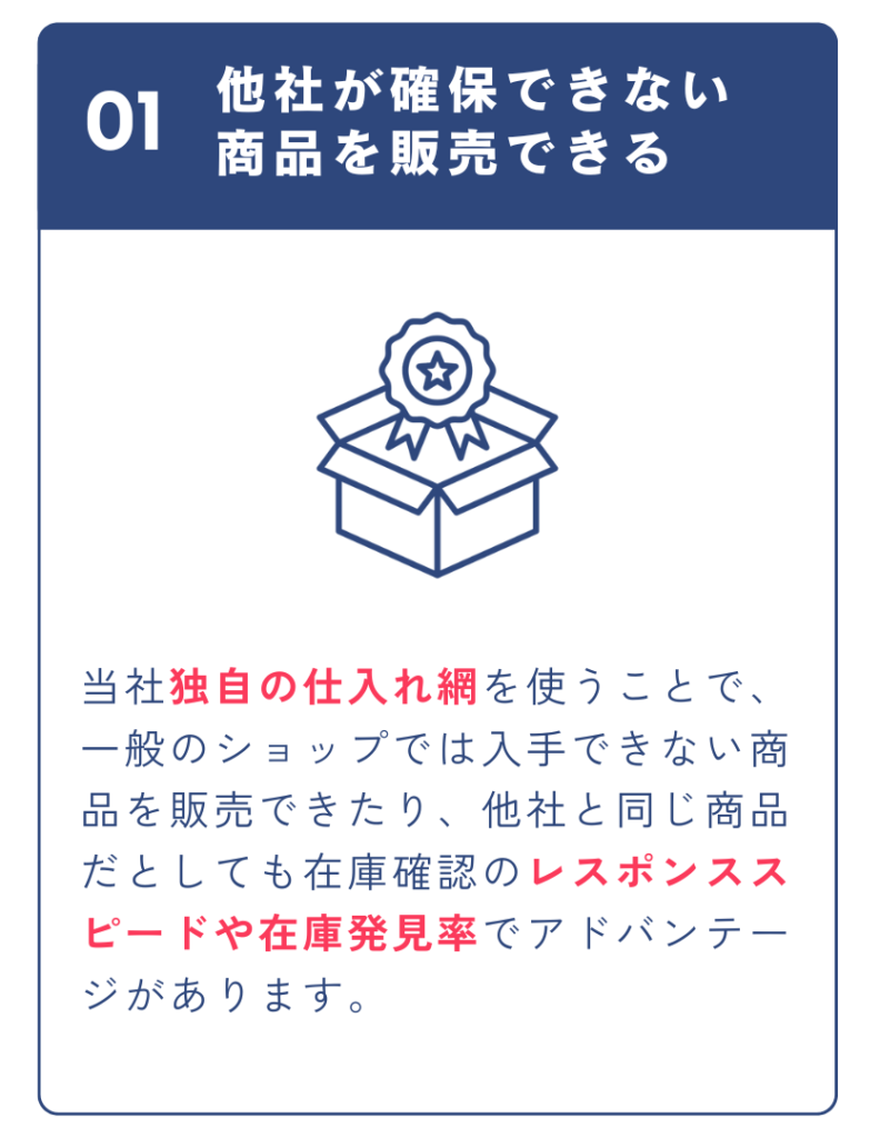 海外限定アイテムや入手困難なレア商品も確保することができるため、開業直後から仕入れ力において圧倒的な競争優位性を担保でき、他社と大きく差別化することが可能です。